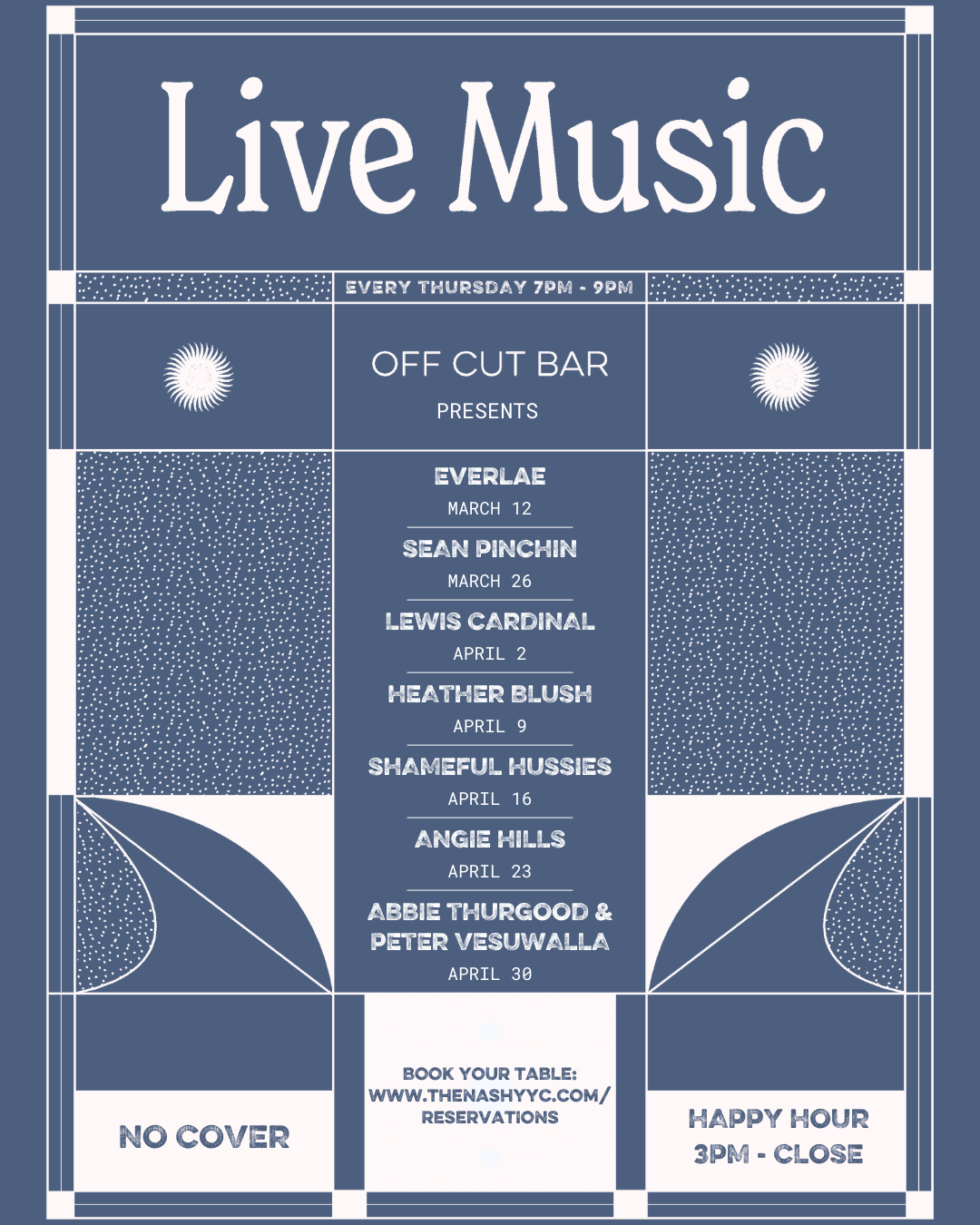 Live MusicThursdays 7-9pm No Cover Happy Hour 3pm ‘til CloseFor music performer inquiries: music@offcutbar.com